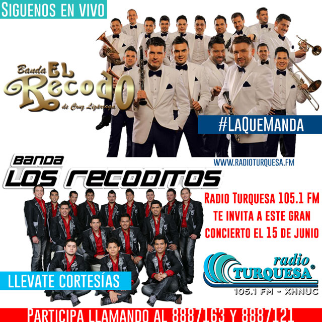 Radio Turquesa te invita al concierto de Banda el Recodo y Los Recoditos en Cancun este 15 de Junio en el Est. Cancun 86, lo unico que debes hacer es mantenerte sintonizando el 105.1 FM de tu radio y participar en las dinámicas que nuestros locutores mencionaran en cada programa.