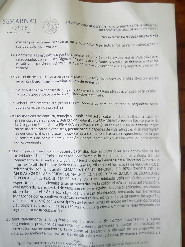 Dicha solicitud fue realizada desde el mes de marzo de 2018 y fue aprobada por el director de vida silvestre de la Semarnat José Luis Pedro Funes Izaguirre.